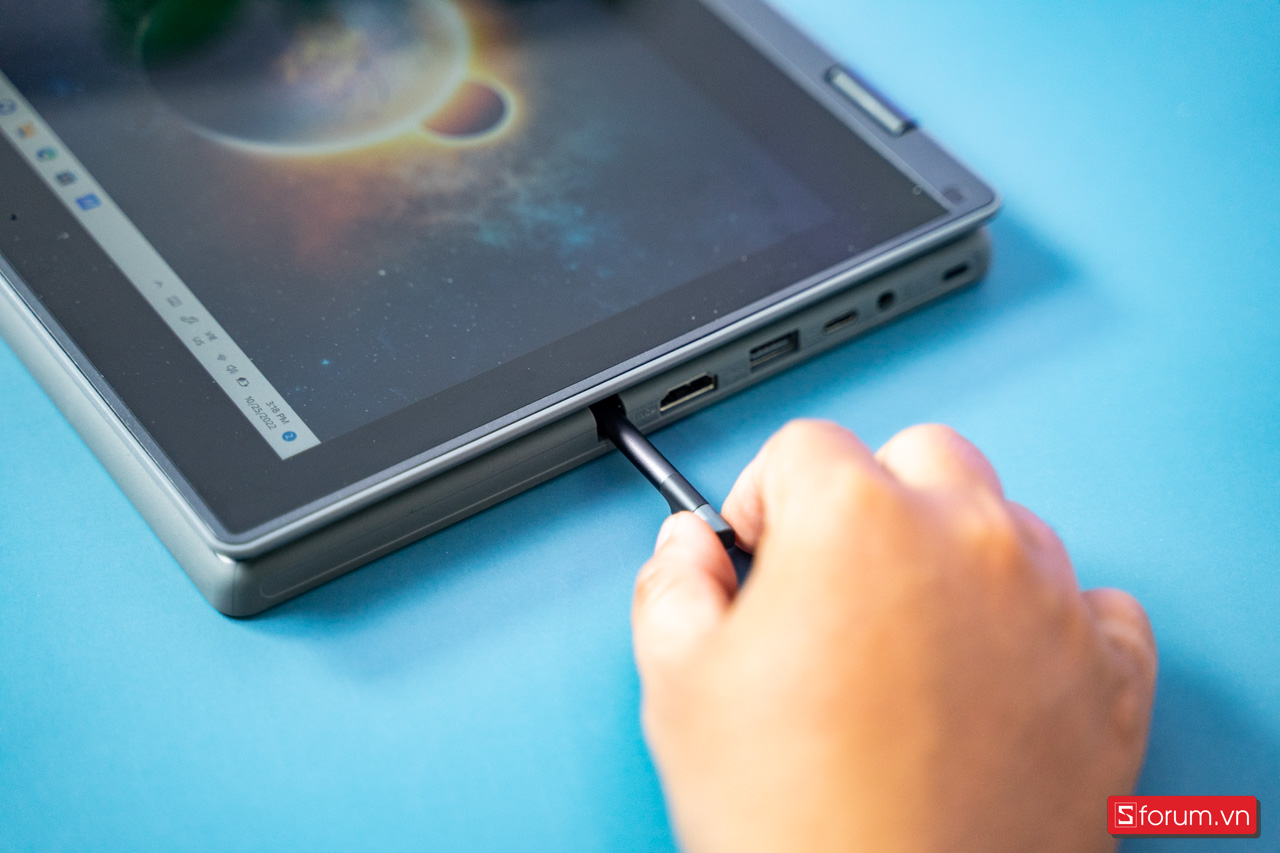 Các cạnh bên được trang bị đầy đủ các cổng kết ở hai cạnh với cạnh phải là cổng mạng lan, USB-A, jack 3.5mm. Ngoài ra ở đây cũng được trang bị nút nguồn và nút tăng giảm âm lượng khá tiện lợi. Cạnh trái là nơi đặt cổng sạc, USB-C, USB-A và cổng HDMI.